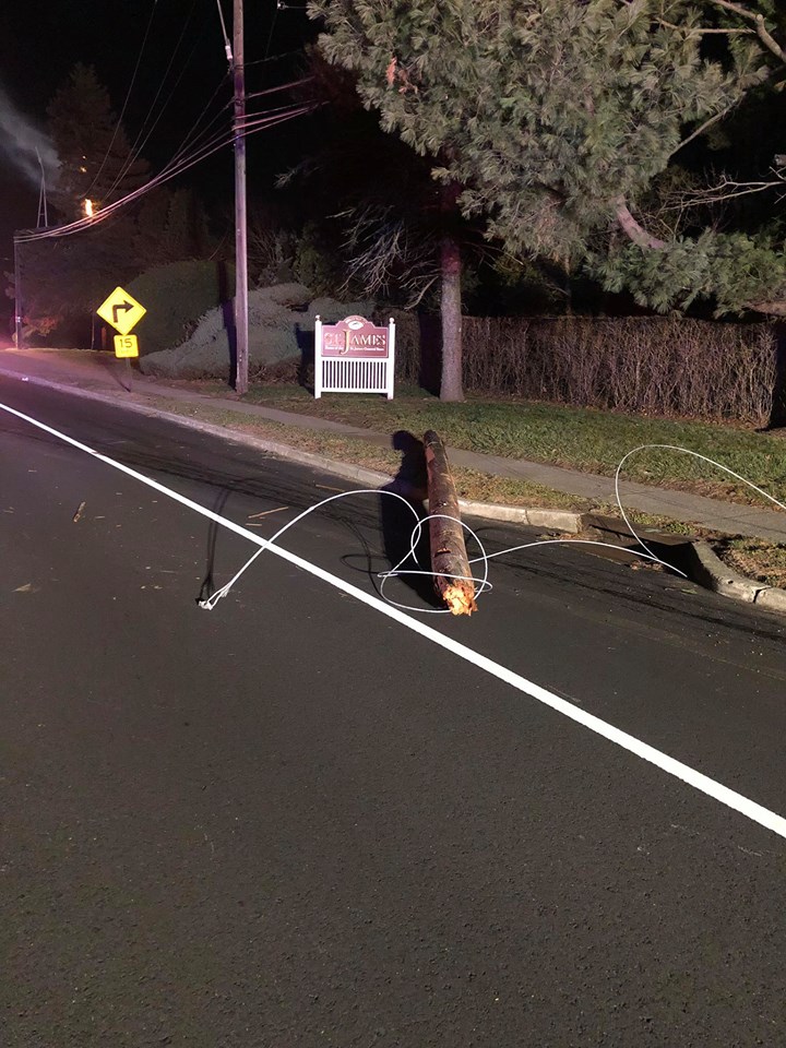 2048 hours. The St. James Fire Department responds to a traffic collision on Moriches Road between Von Hagen Ave and Fairfield Drive. Units arrive to find that vehicle struck a tree and a utility pole, brining down the wires. The operator of the vehicle self-extricated and was transported via ambulance to the hospital with minor injuries. Power was out in the area for a few hours while PSE&G replaced the pole and restored the circuits. Chiefs Mills and Gonzales operated with engines 1, 3 Rescue 9 and ambulance 61. Photos courtesy of St. James FD.