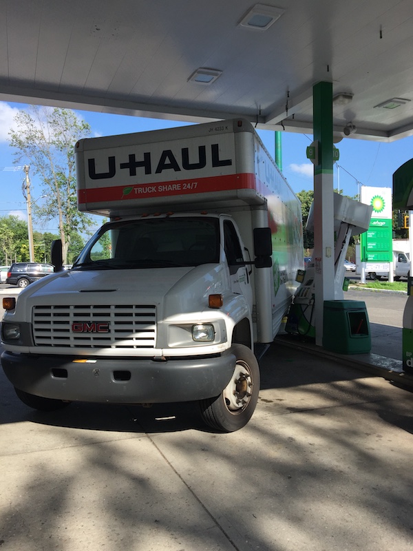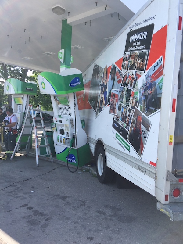 The Nesconset Fire Department responds to the BP Station at 762 Smithtown Bypass at 1610 hours in regards to traffic collision involving a small box truck and a fuel island. Units arrived to find that the operator of a rented truck struck one of the pumps, dislodging it from its base and severing two of the fuel lines feeding it. FD personnel shut down the pumps and stabilized the pump to prevent further damage. A wrecker was brought in to remove the truck, which was stuck on a concrete bollard (used to protect the pump. Once the truck was removed. units cleared the scene,. There were no injuries.