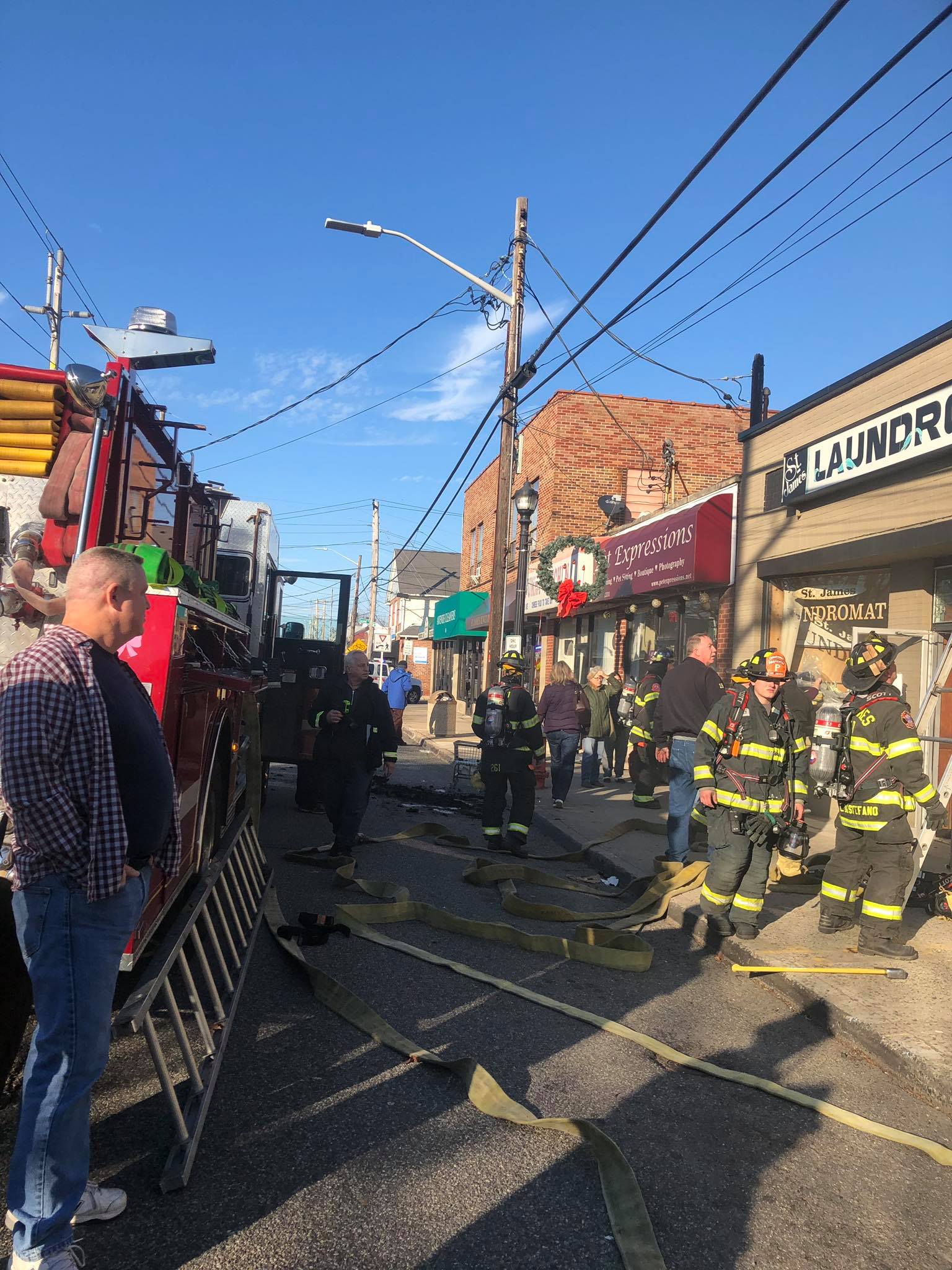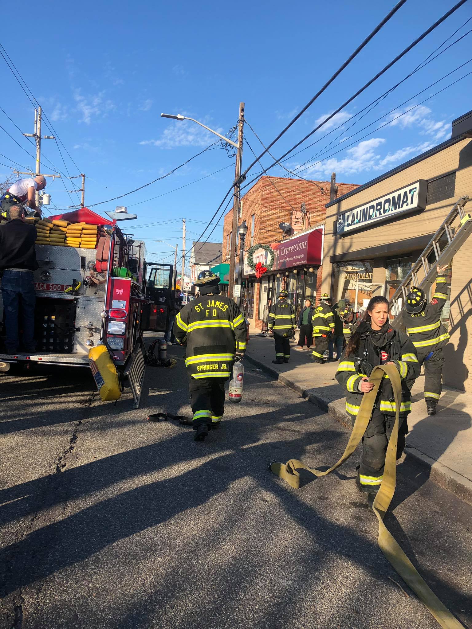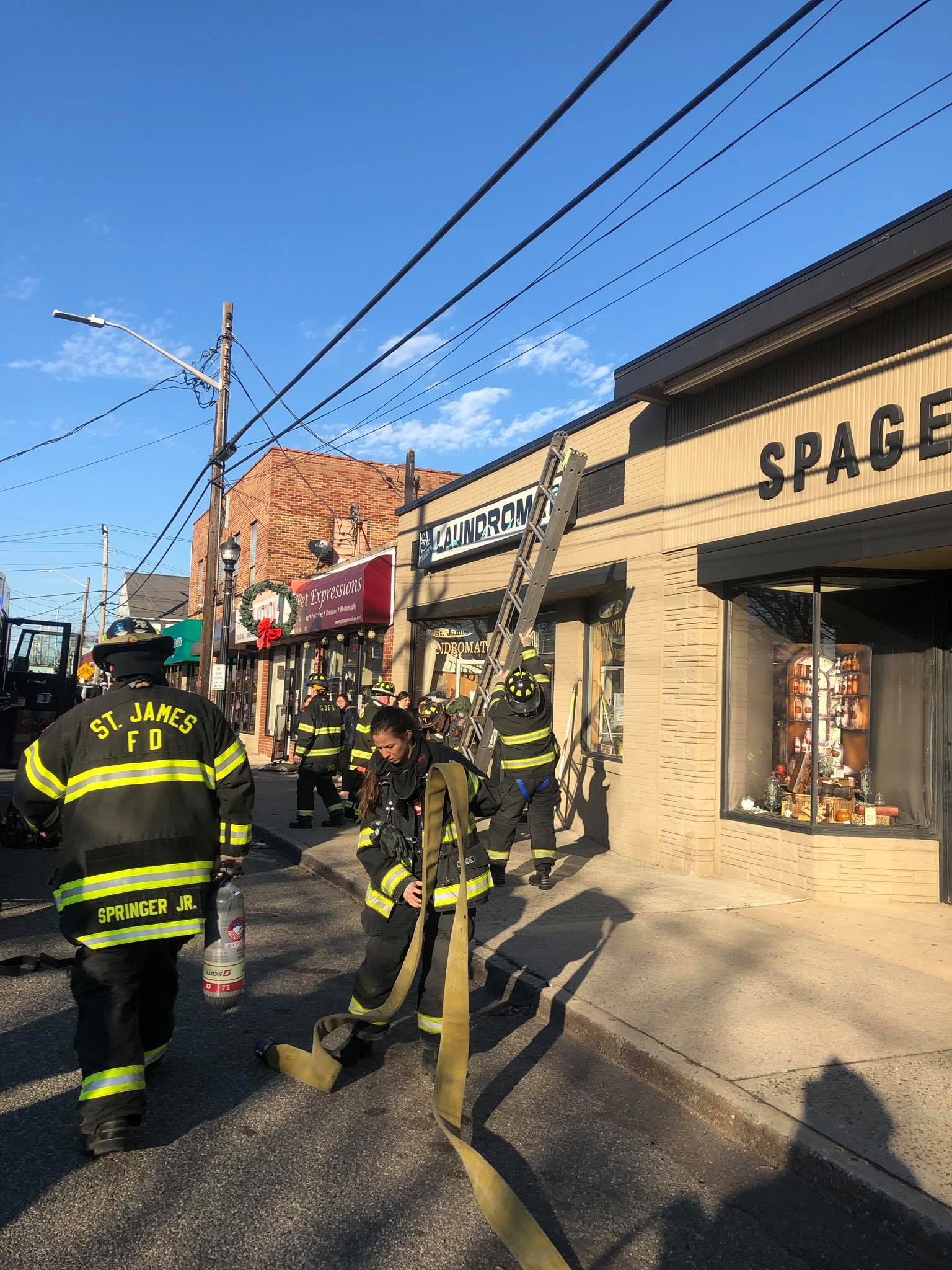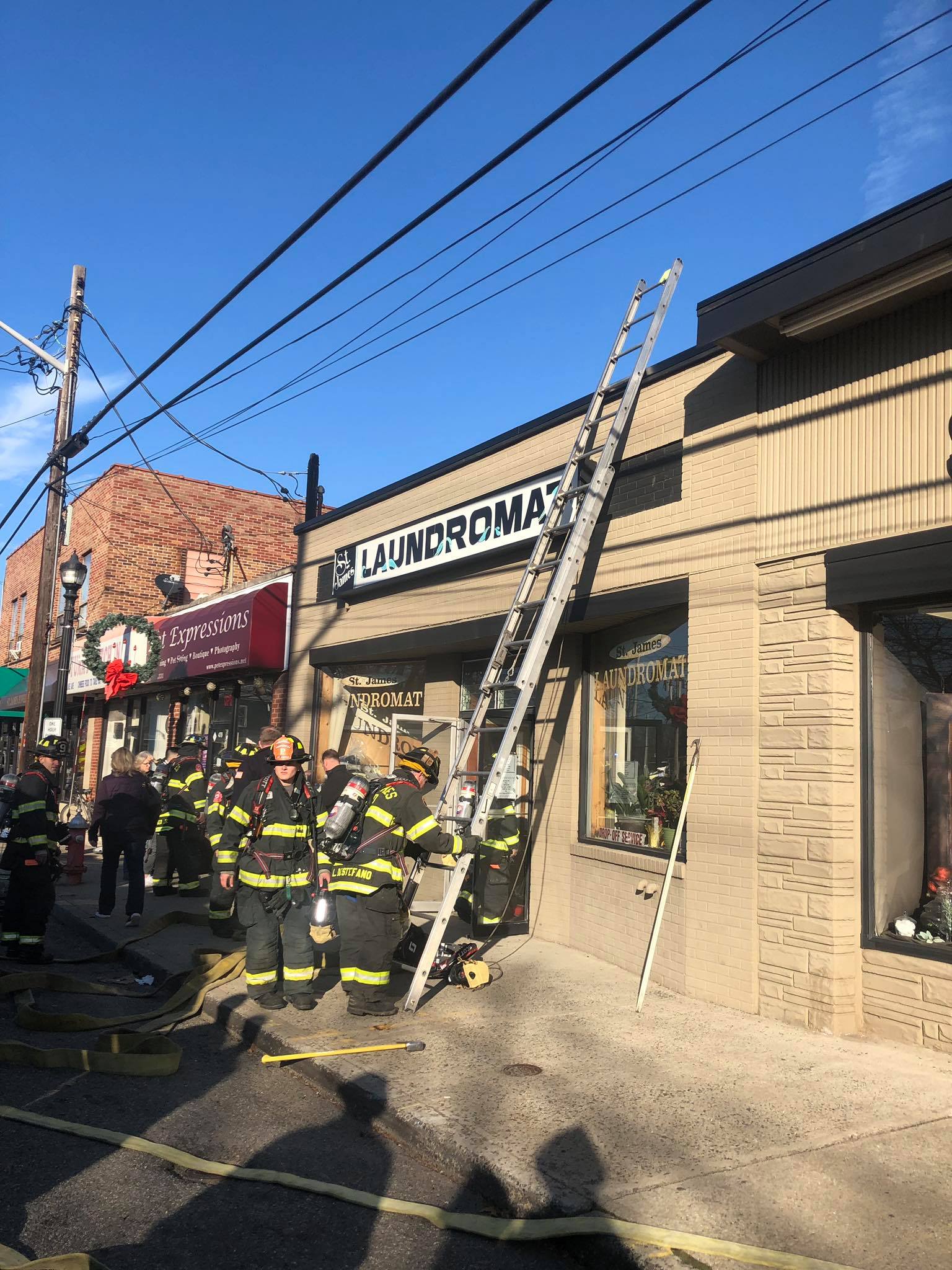 1350 hours. The St. James Fire Department responds to a report of a fire in the St. James Laundromat at 473 Lake Avenue. Units arrive to find smoke in the building. A quick investigation finds a fire in one of the clothes dryers. FD personnel quickly extinguish the fire and clear the smoke from the building. The dryer was disconnected and the scene turned over to Fire Marshals from the Town of Smithtown Department of Public Safety There were no injuries. Dave Mills was the Chief in charge and operated with St. James engines 1, 3 and Rescue 9. The Nesconset Fire Department also sent a unit to the scene. Photos courtesy of the St. James Fire Department.