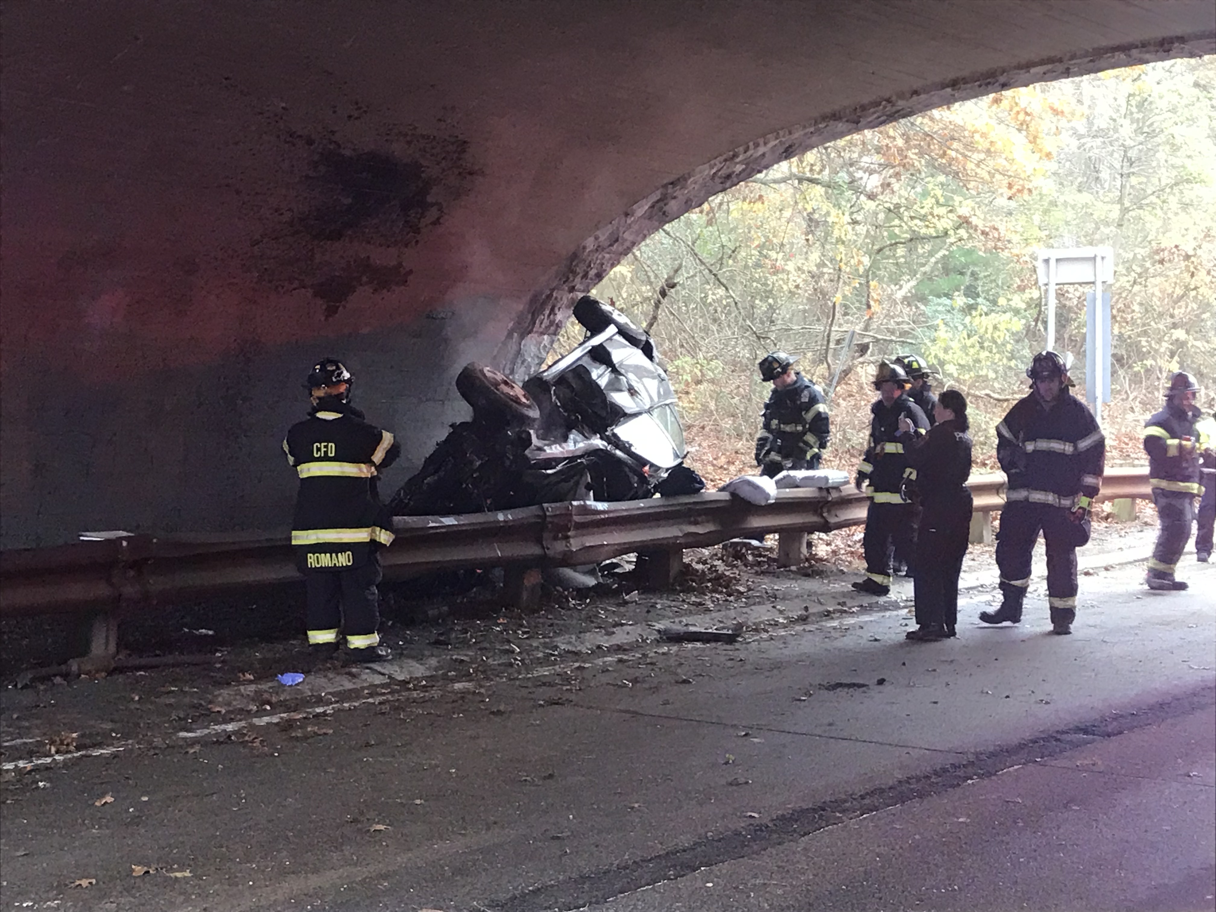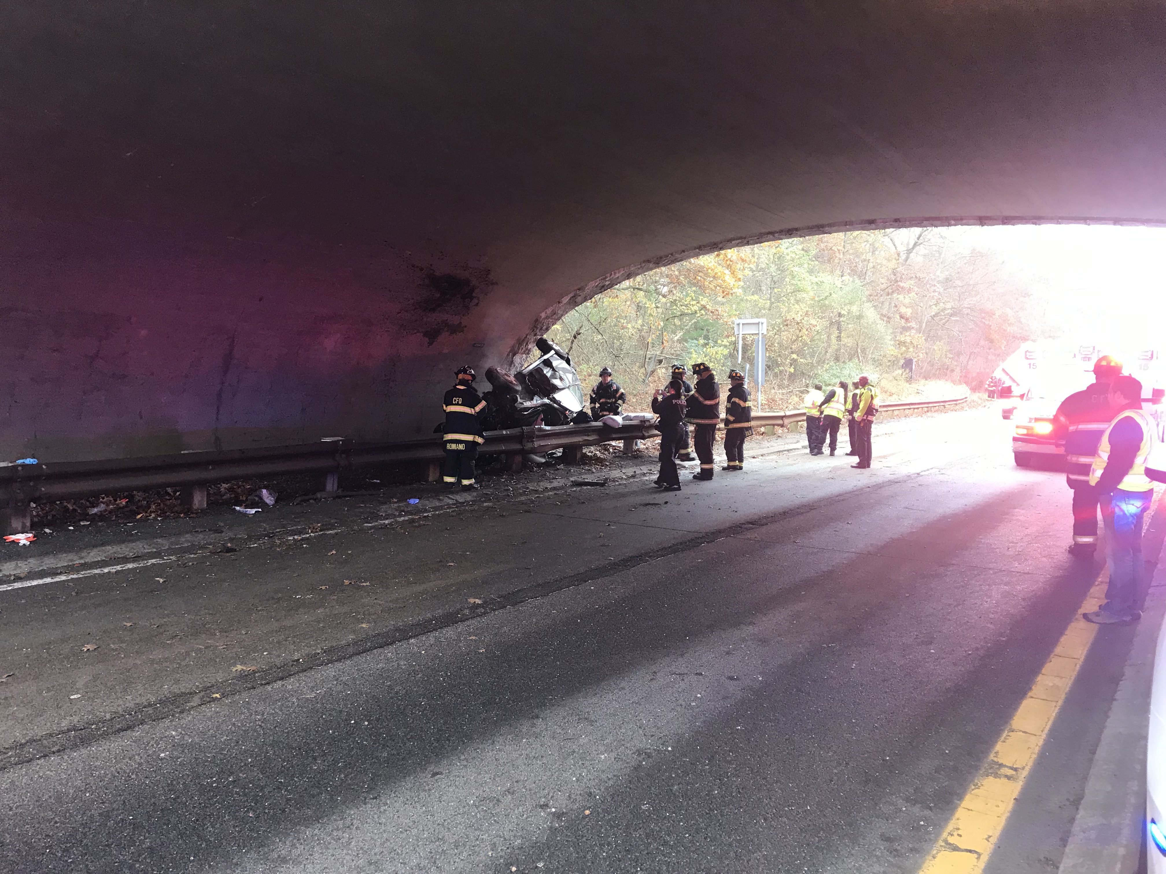1022 hours. The Commack Fire Department was dispatched with CVAC, SCPD and the NYS Police to a traffic collision on the Northern State Parkway. Units arrived to find the a single vehicle had left the roadway, stoking a number of signs and a pole, overturned, landing upside down between the guardrail and the inside wall of the New Highway overpass. The lone occupant was ejected and was pronounced dead a the hospital. The westbound Northern State Parkway was closed for a few hours for the State Police investigation.