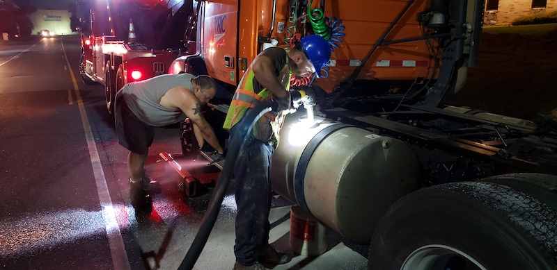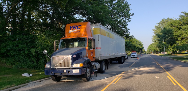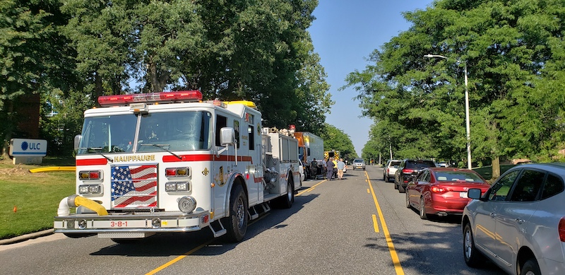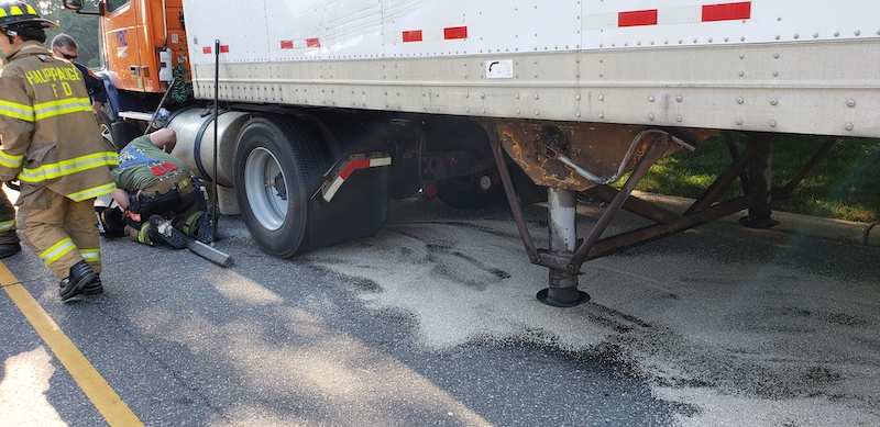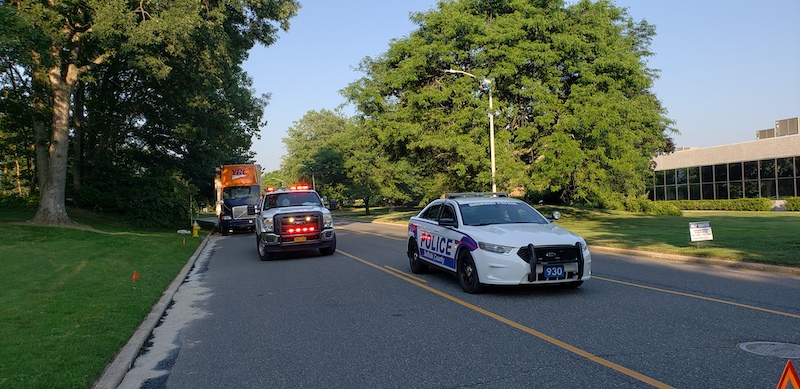 Hauppauge Fire Department responds to a truck leaking fuel on Arkay Drive. Units arrive to find that a tractor trailer struck a manhole cover which tore a hole in the drivers side fuel tank. The driver pulled over and called 911 while approximately 130 gallons of diesel fuel spilled into the roadway and down into the sewer system. FD personnel stopped the leak at the tank and shut down the fuel supply. Speedy dry was applied to the roadway and a sander was brought in from the Town of Smithtown Highway Department to cover the road with dirt. A Fire Marshal from the Town of Smithtown Department of Public Safety was called to the scene to handle the spill. The New York State Department of Environmental Conservation was also called in. Suffolk County Police Department Motor Carrier Safety Section came to the scene to inspect the truck.