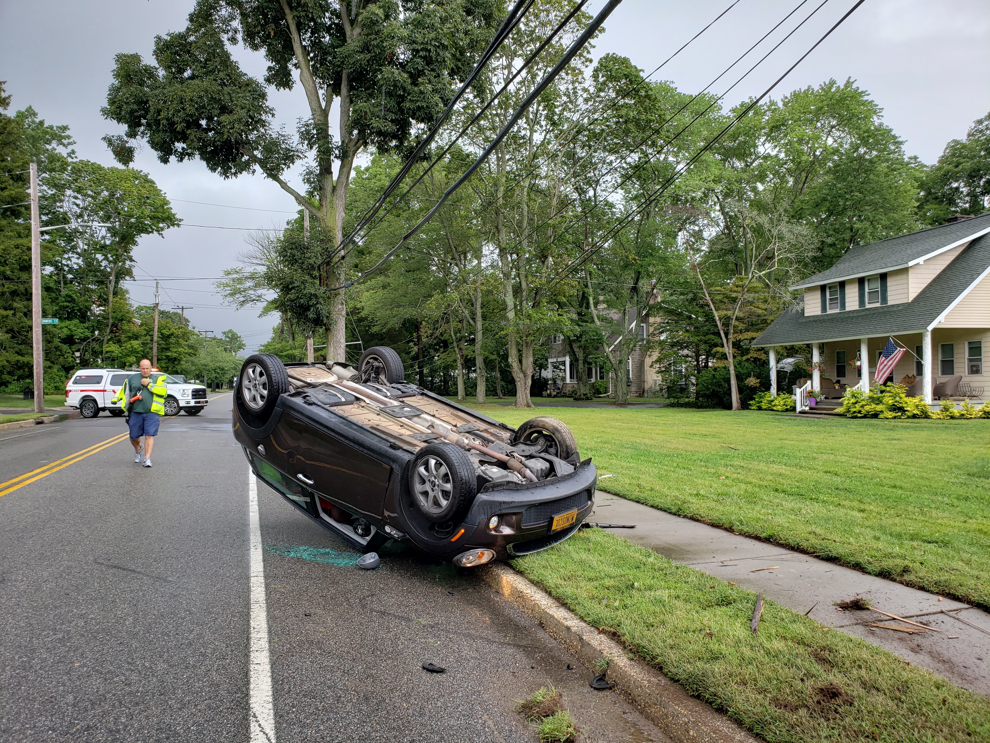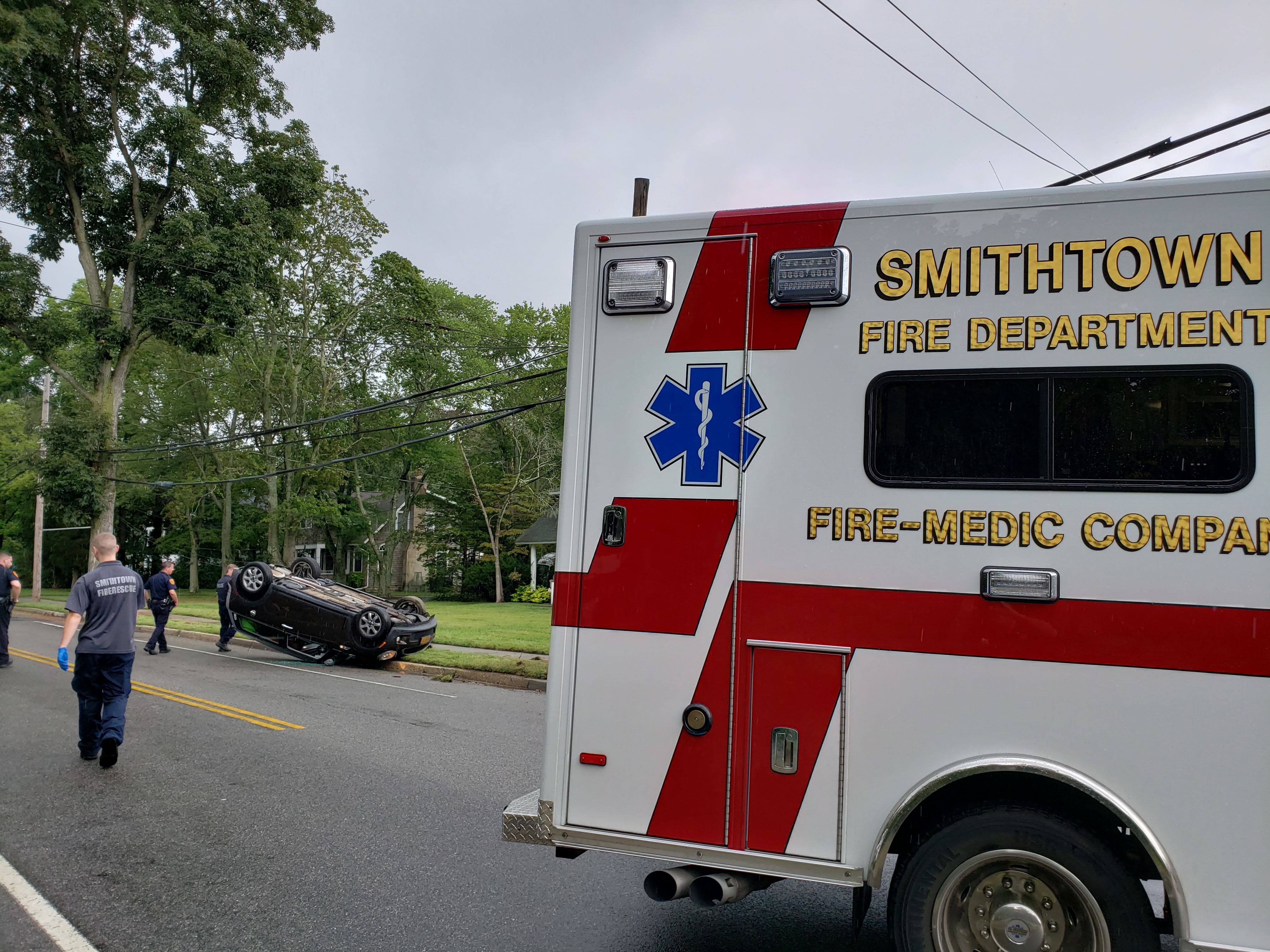 1255 hours. The Smithtown Fire Department responds to a traffic collision on Maple Avenue. Units arrive to find a crash involving a single vehicle that left the roadway and struck a utility pole at the corner of Maple and Bowers Court. The driver self extricated and suffered minor injuries. The victim was transported to the hospital via Smithtown Fire Department ambulance.