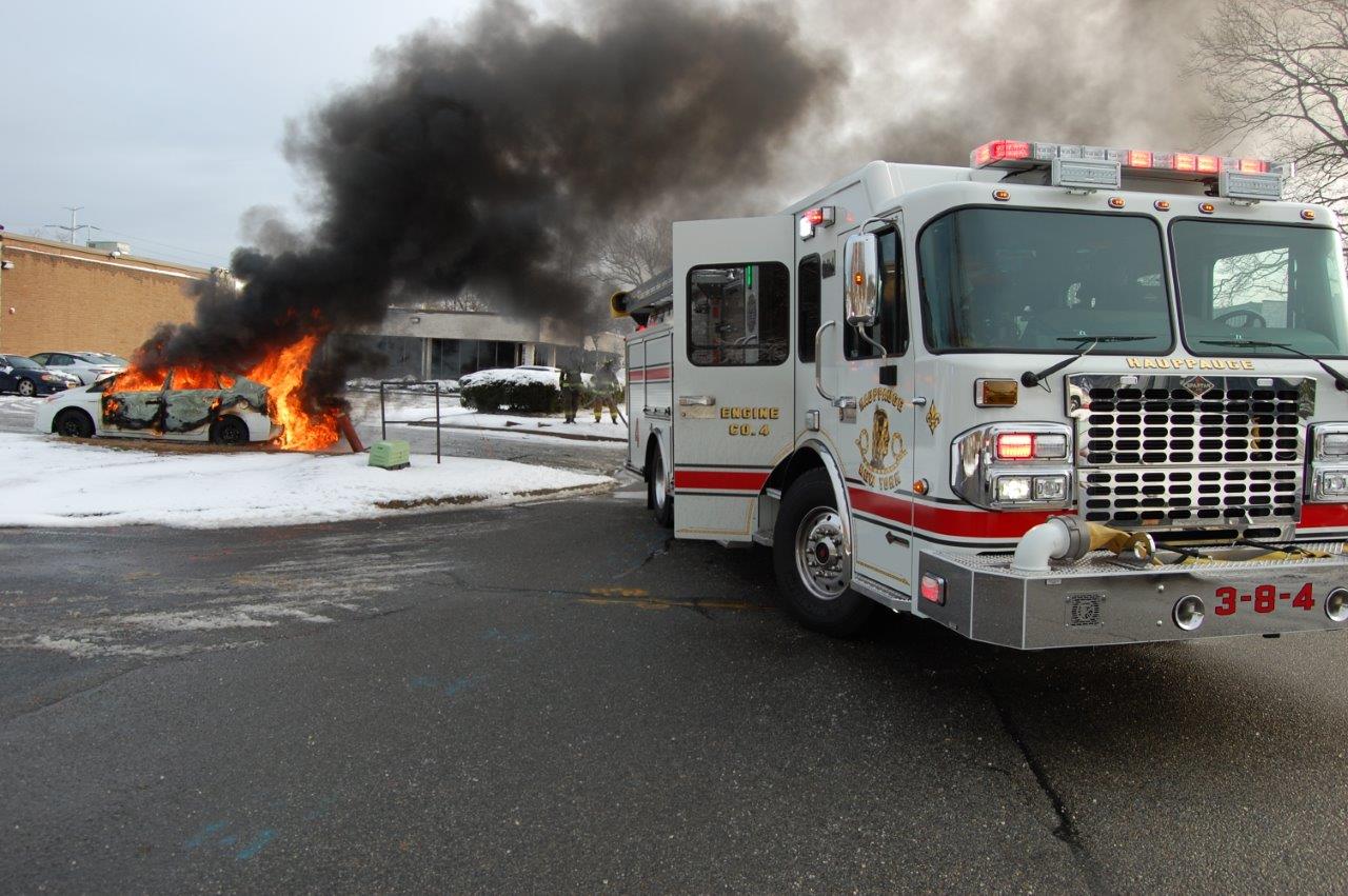 0839 hours. Hauppauge Fire Department responds to report of a vehicle on on Nicon Court at Rabro Drive. Units arrive to find a fully involved 2010 Toyota Prius hybrid that had just been parked in the street. The vehicle operator stated that she had parked the vehicle and went into work. She further stated that she came out to retrieve her glasses and noted fire in the steering column. Engines 3-8-4 and 13 operated at this incident under the command of Acting Assistant Chief Kenneth Furuno. The vehicle was a total loss. There were no injuries.