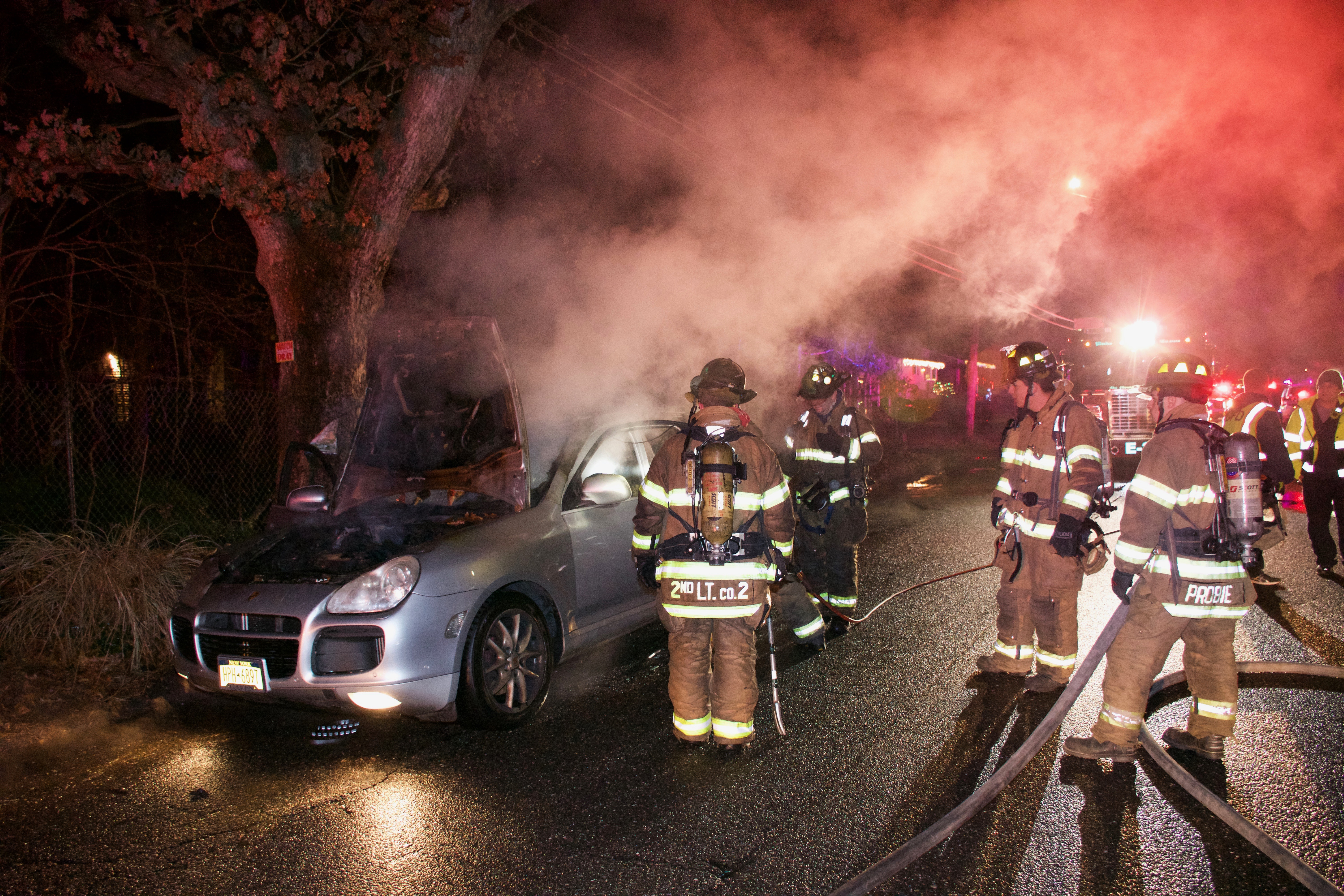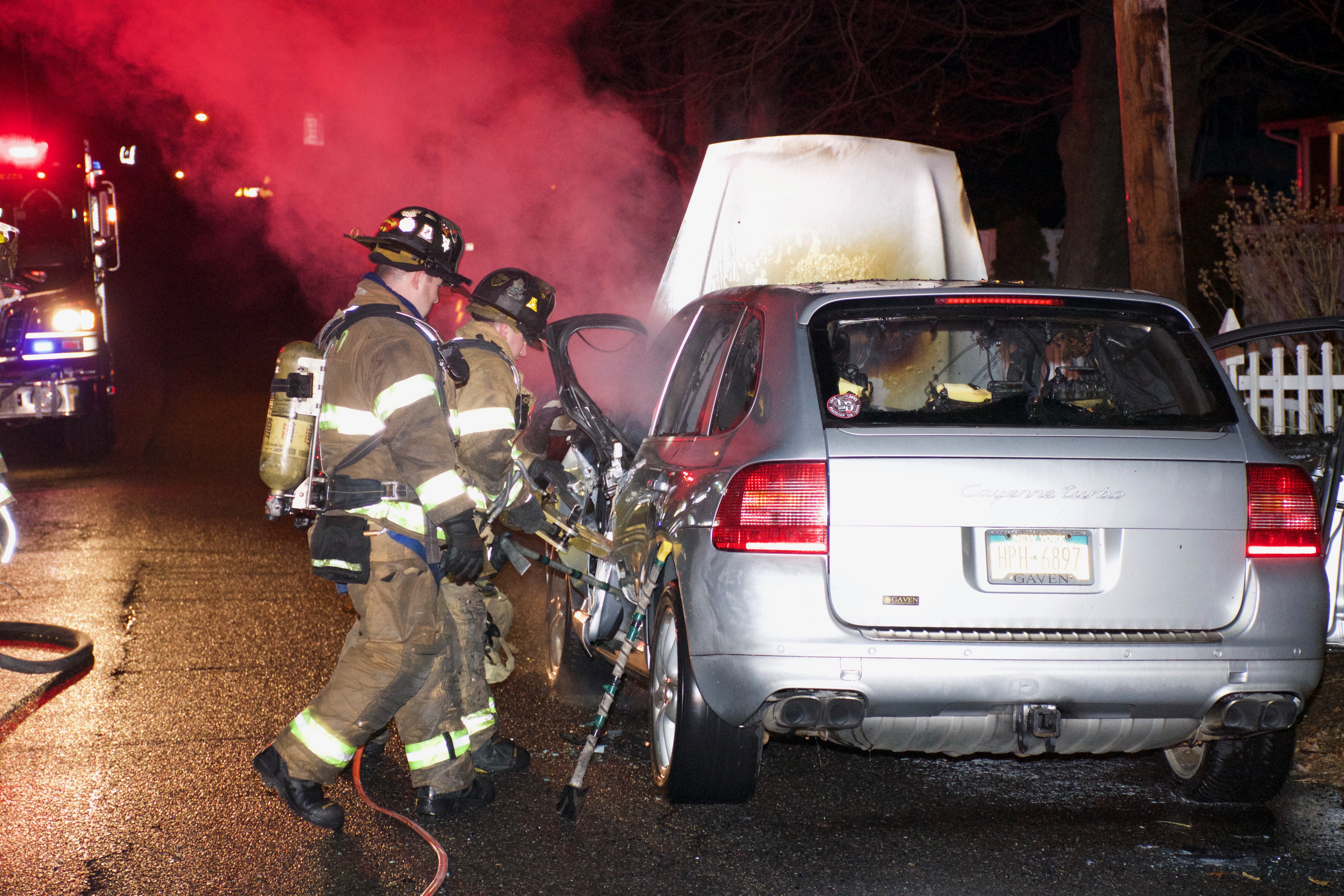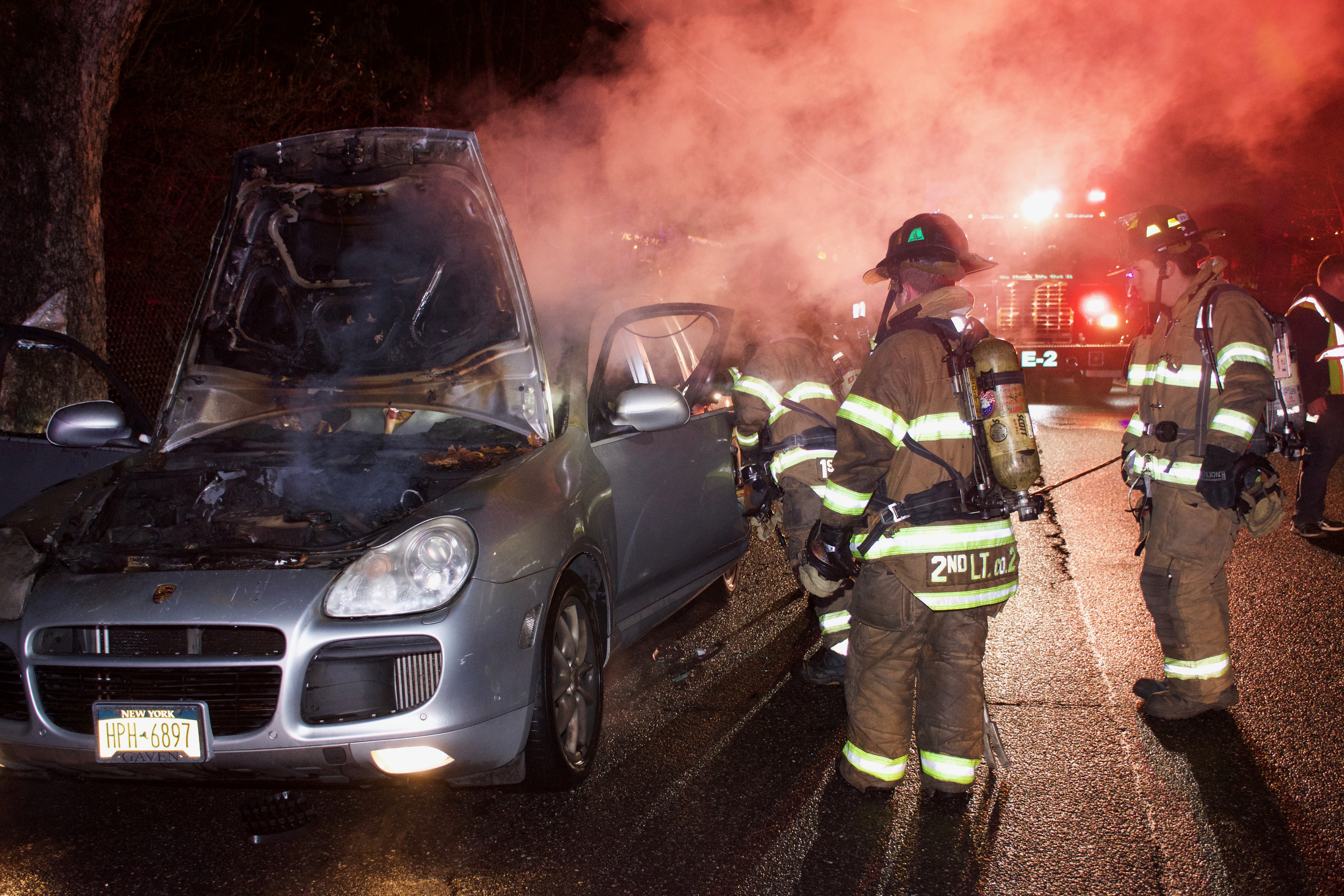 1750 hours. Centereach Fire Department responds to a report of a car fire on Wood Road, north of Middle Country Road. Units arrive to find a Porsche Cayenne Turbo burning in front of 42 Wood Road. Chief of Department Robert Corley operated with Engines 2, 9 and Fire Police. Crews used hydraulic tools to enter the passenger compartment to extinguish the fire. There were no injuries.