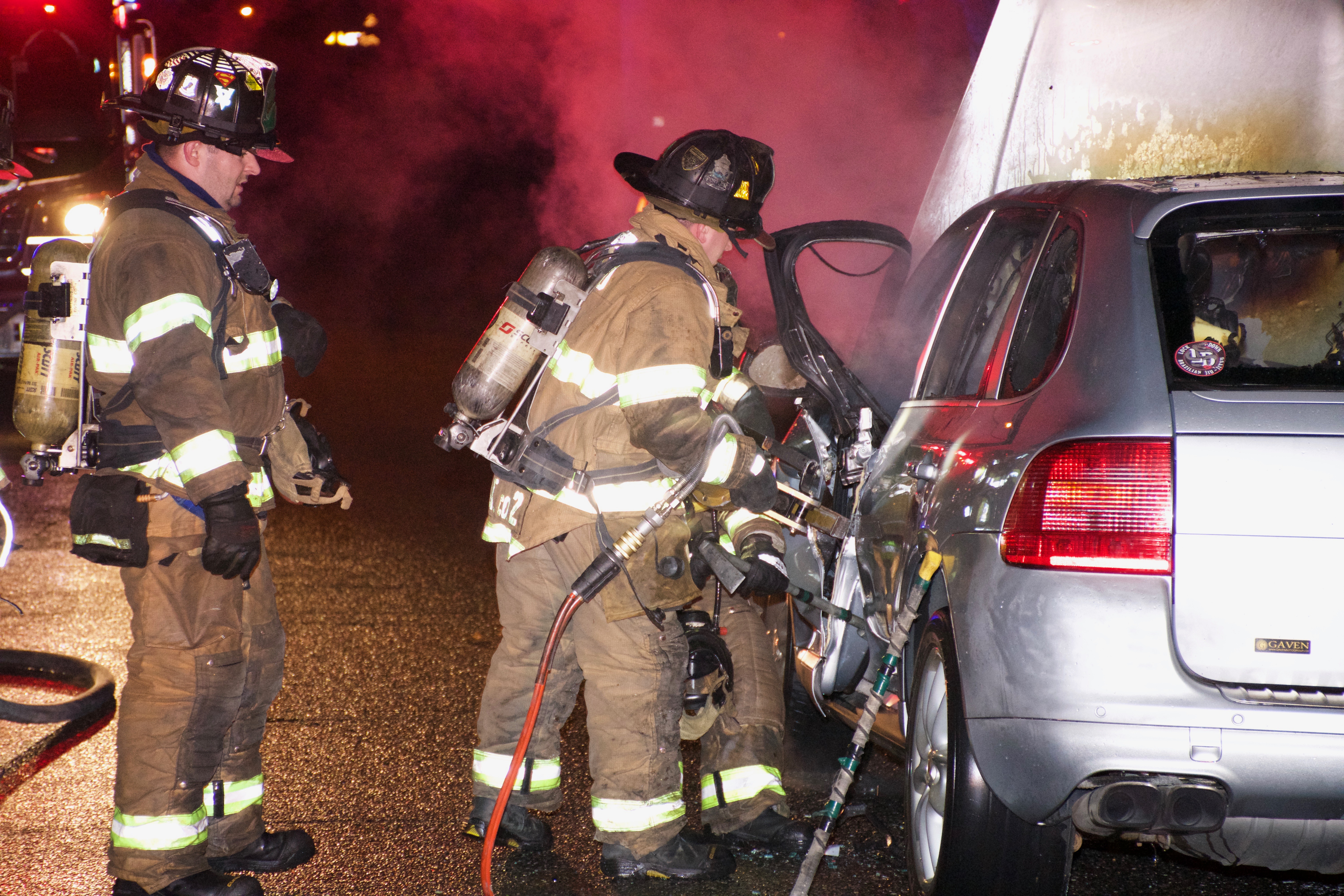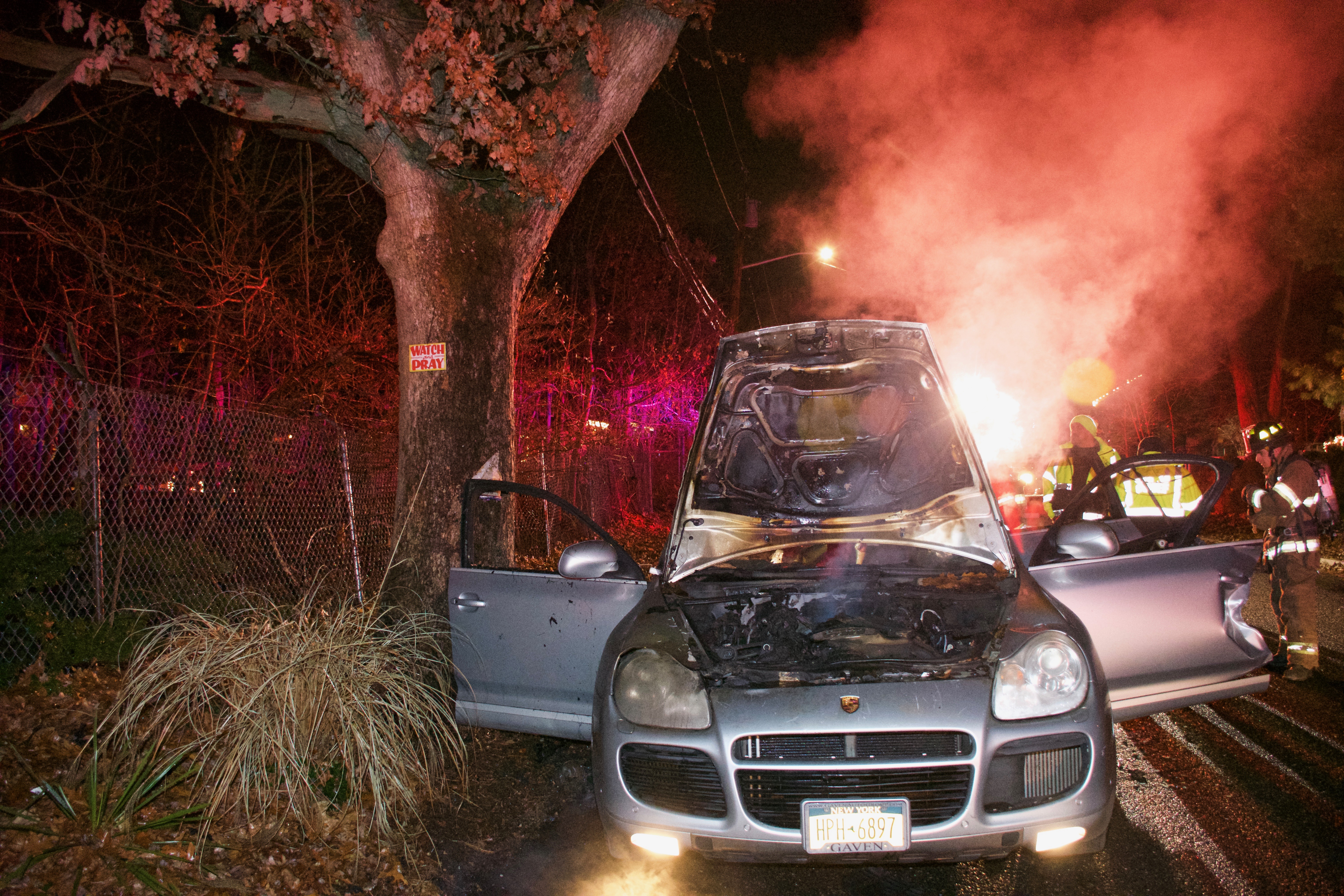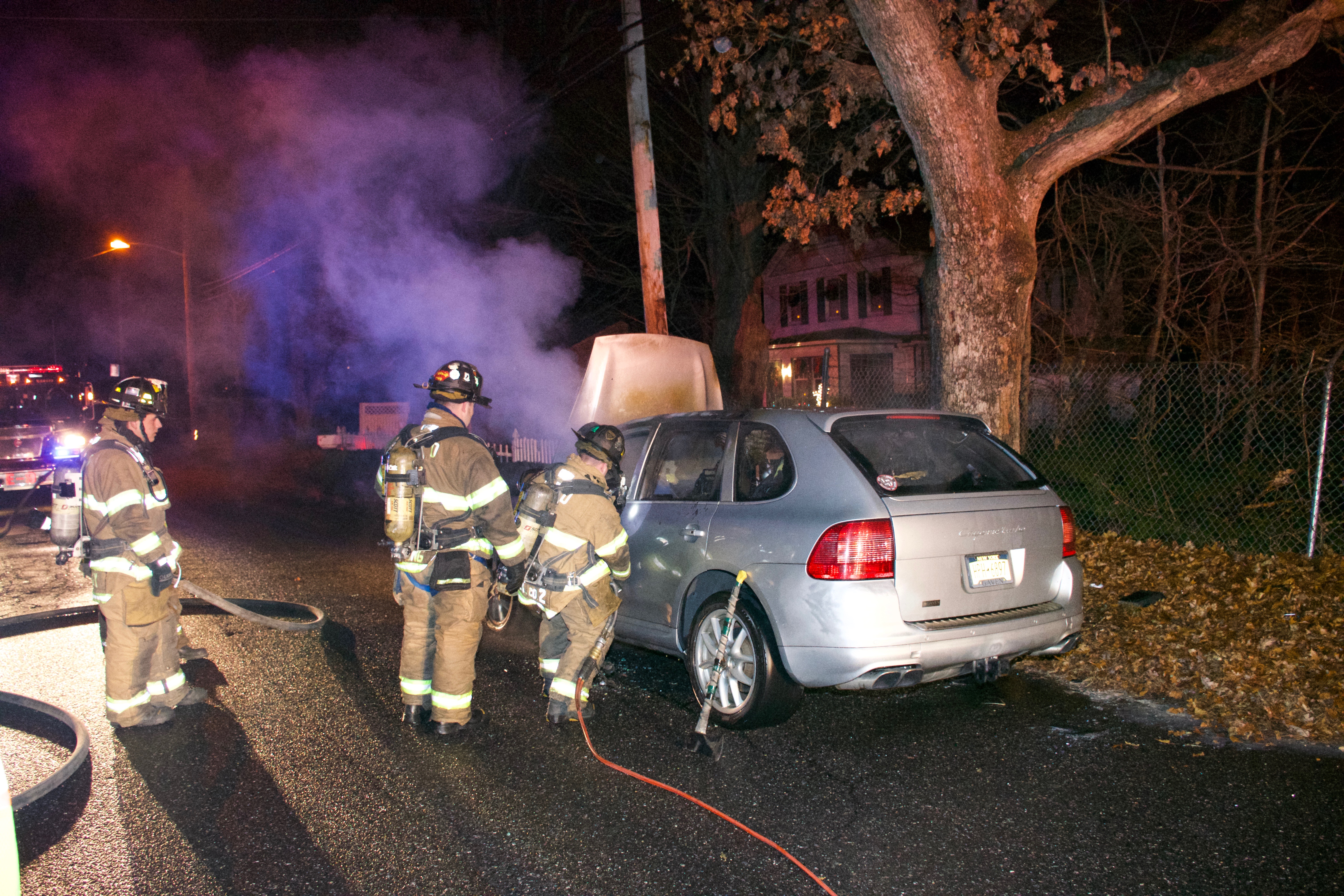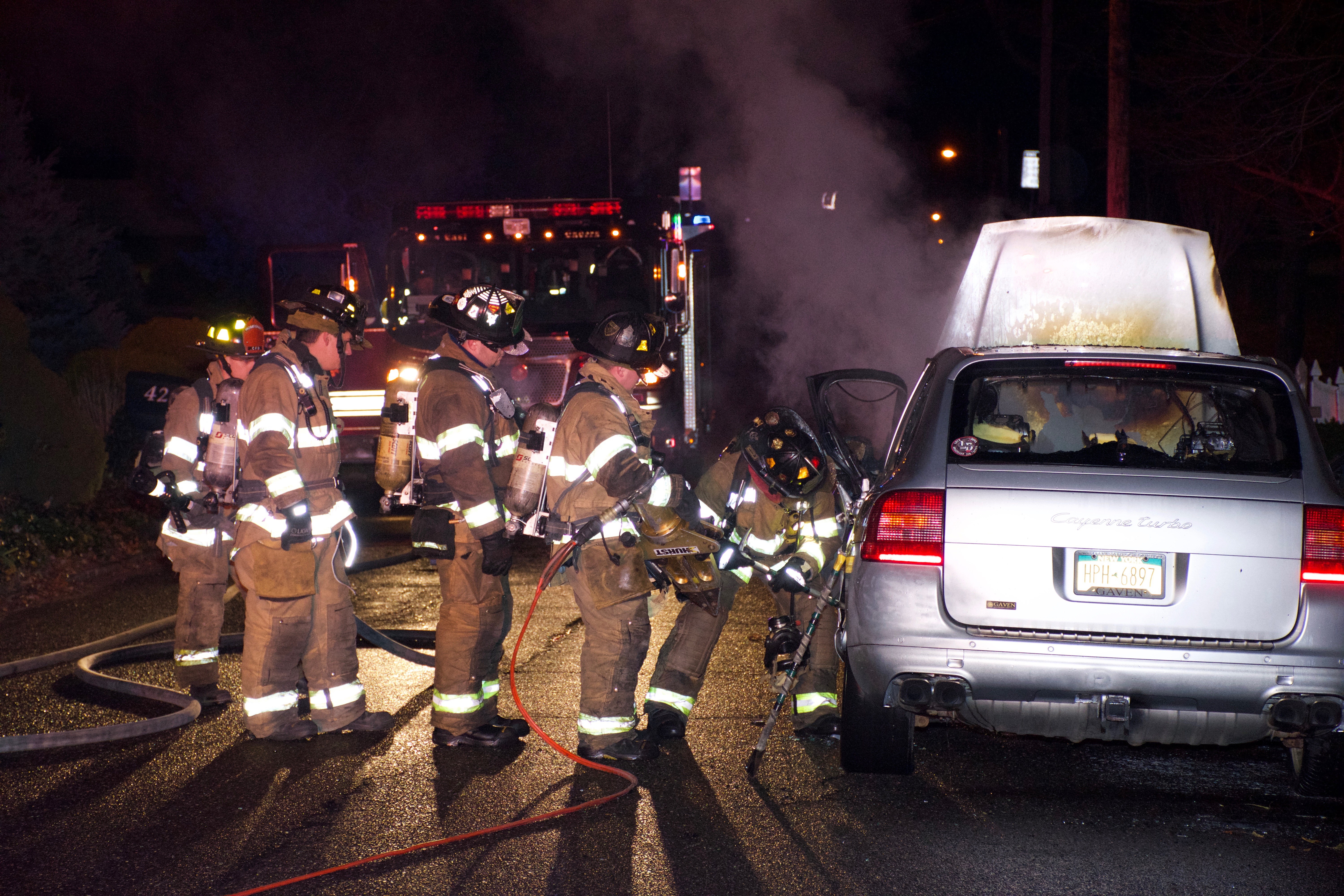 1750 hours. Centereach Fire Department responds to a report of a car fire on Wood Road, north of Middle Country Road. Units arrive to find a Porsche Cayenne Turbo burning in front of 42 Wood Road. Chief of Department Robert Corley operated with Engines 2, 9 and Fire Police. Crews used hydraulic tools to enter the passenger compartment to extinguish the fire. There were no injuries.