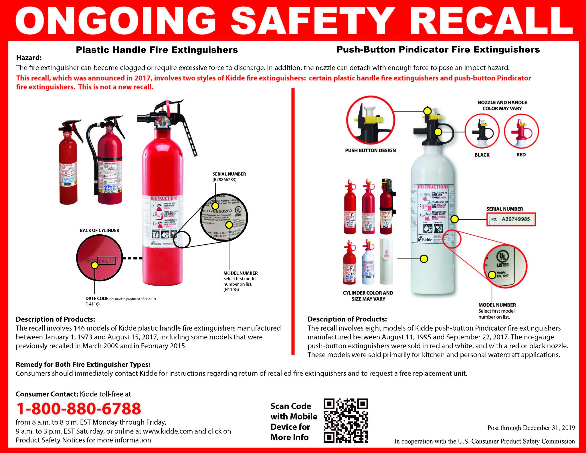 Kidde would like to ensure all fire extinguishers recalled in 2017 have been replaced. Please check your extinguishers and contact Kidde for a replacement if you have one of the recalled models.